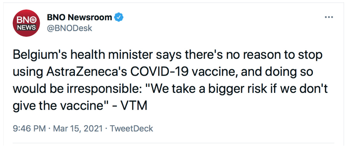 And now this. I continue to be very confident in vaccines, including AstraZeneca, convinced that they have been approved because they are safe. I wish there was a Medical Consent Form which I could sign and personally accept  the vaccine, rather than having to wait even longer because of delays caused by this media-induced scaremongering.