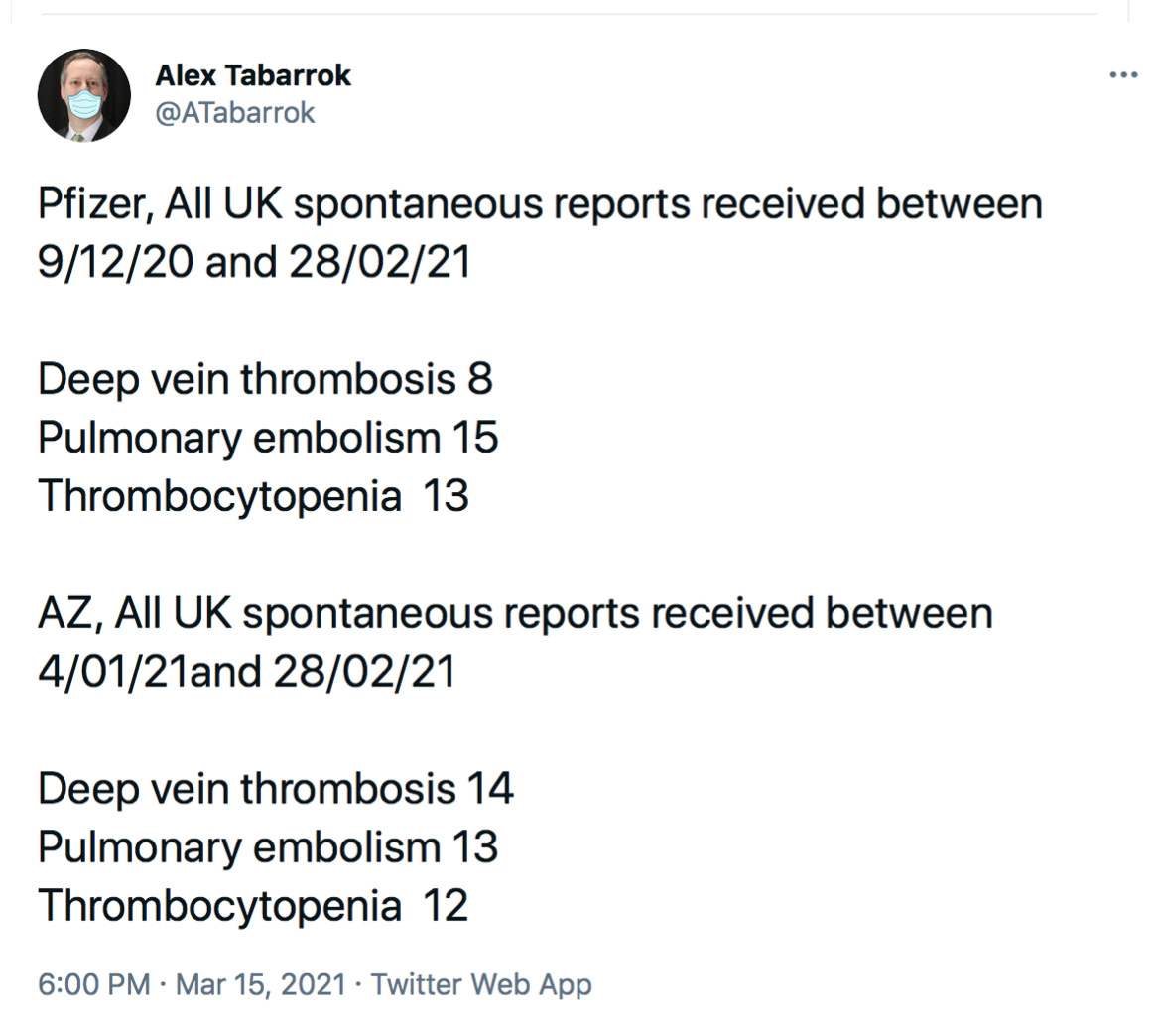 From the MedDRA reports (see Pfizer and AstraZeneca links below), it is clear that the number of ‘standard’ thrombosis-related deaths after vaccination equates with the expected number of thrombosis-related deaths under normal conditions. If there was a correlation, then countries where millions of people vaccinated with AstraZeneca would show a marked increase in cases of thrombosis, but there has been no such increase recorded to date (after 10 million vaccinations in the UK, 79 cases of blood clotting, of which 19 fatal). The numbers of thromboembolic events are comparable among those vaccinated with Pfizer and AstraZeneca, the same way they are comparable in the unvaccinated population. As the EMA chairwoman declared on Tuesday, the number of thromboembolic events that occurred during the trial phase among those who received the vaccine were comparable to those that occurred to the people who received a placebo.