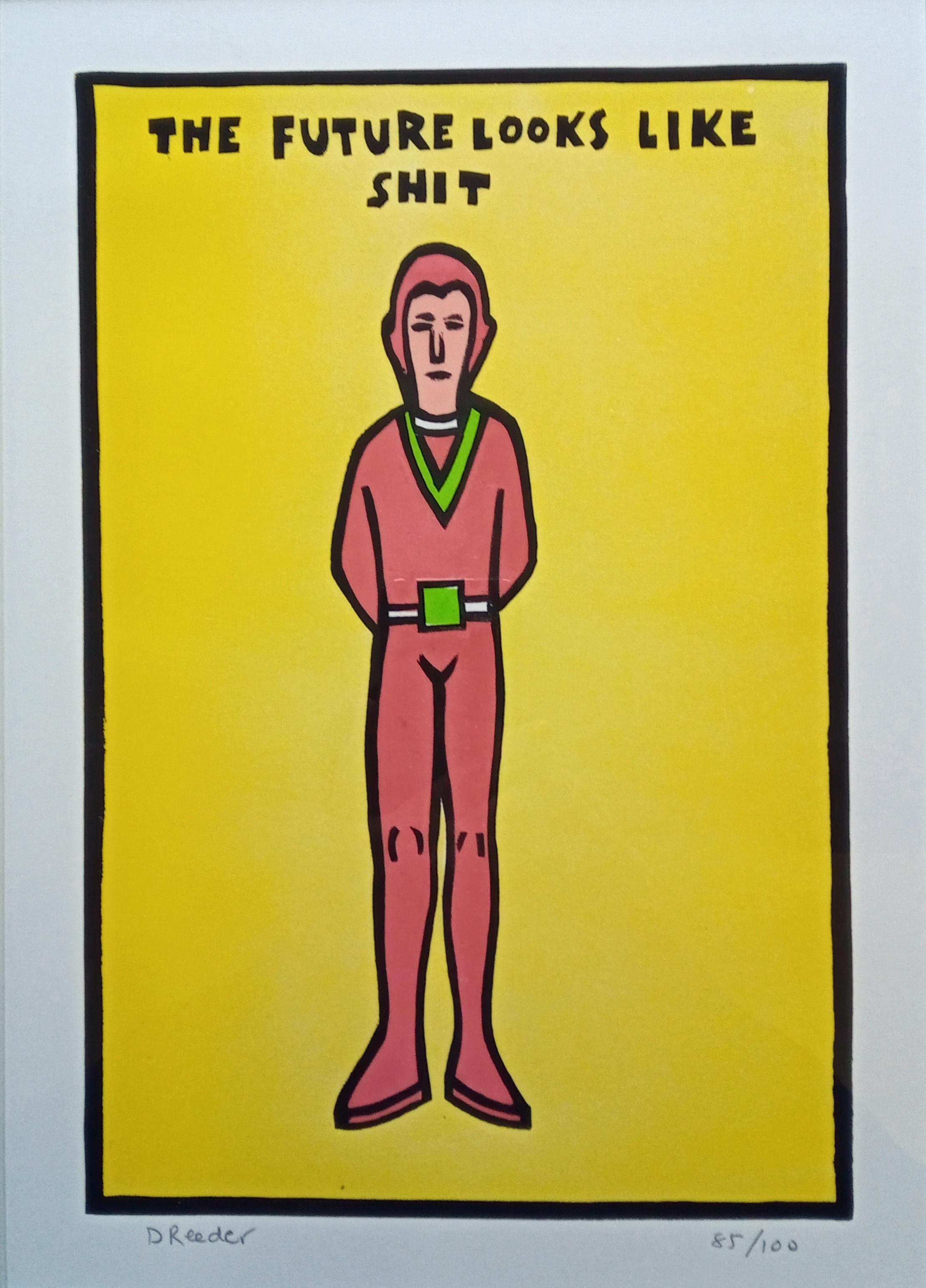 Dan Reeder: Lots of them…Uh, I am a fan of David Schrigley. He does sort of what I do, only better. I also like Damien Hirst, David Hockney, Jeff Coons, John Prine, Lyle Lovett, Pink, Marvin Gaye, Dolly Parton, Jeff Beck and Aretha Franklin…and the list keeps getting longer.